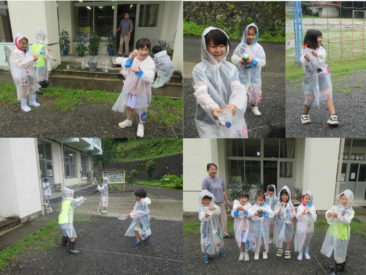 6月24日(火)の4時間目に、1年生が生活科で水遊びをしました。レインコートには子供たちそれぞれがカラフルにペイントしました。そのオリジナルのレインコートを着て、お互いに水をかけ合ったり、水をまいたりと楽しそうに活動していました。