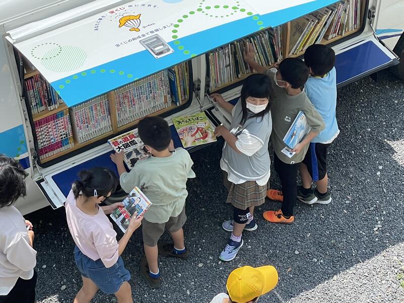 22日、水俣市立図書館から自動車いっぱいに本を積んで来ていただき、子どもたちが好きな本を借りることができる巡回図書が今年度はじめて行われました。