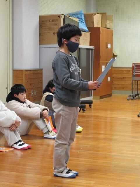 1月17日(水)集会活動の時間に、各学年・各クラスからの代表が3学期の目標を発表しました。低学年の児童も学習面や生活面、家庭での目標等よく考えられた内容を堂々と発表してくれました。立派でした。