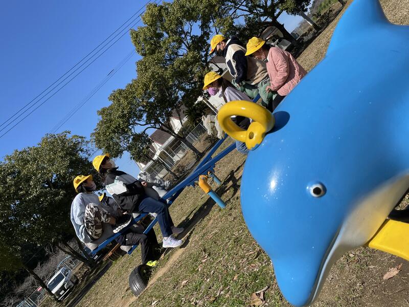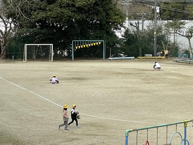1年生が運動場で竹トンボを元気に飛ばしていました。