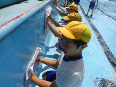 〇 ぼくは、ブラシでこするのが楽しみでした。水がかかって涼しかったです。プールの底をみがくのは大変でした。 でも、水切りをするのは楽しかったです。みんなと遊んだ気持ちがしました。これでやっと、プール開きができます。