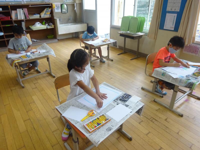 本日、図工の授業でクレパスやパステルを使ったぼかし遊びに挑戦しました。クレパスやパステルで模様や絵を描き、それを手の指やティッシュを使ってぼかしました。始めての体験で、子どもたちは「おー!すごい!」や「早くやってみたい!」とやる気満々でした。