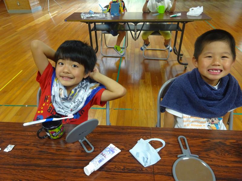 村﨑先生によるブラッシング指導では、虫歯になりやすい場所に合った磨き方を教えていただきました。歯の内側は、ブラシの側面を使うことや、前歯は縦に動かして磨くこと、歯と歯茎の間は、歯茎に当たっていることを確かめることなど、コツをたくさん教えてもらった子どもたちです。