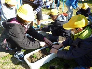 一人に一苗ずつ植えました。花が咲いているものを選ぶ子もいれば、これから咲く苗を希望する子もいました。