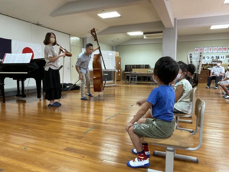 音楽室やロビーなどで生の演奏を間近に聴いたり、音楽や楽器にまつわる話などを演奏家から直接聴く機会をつくることによって、音楽ファンを増やしていこうというアウトリーチ事業が本校で行われました。