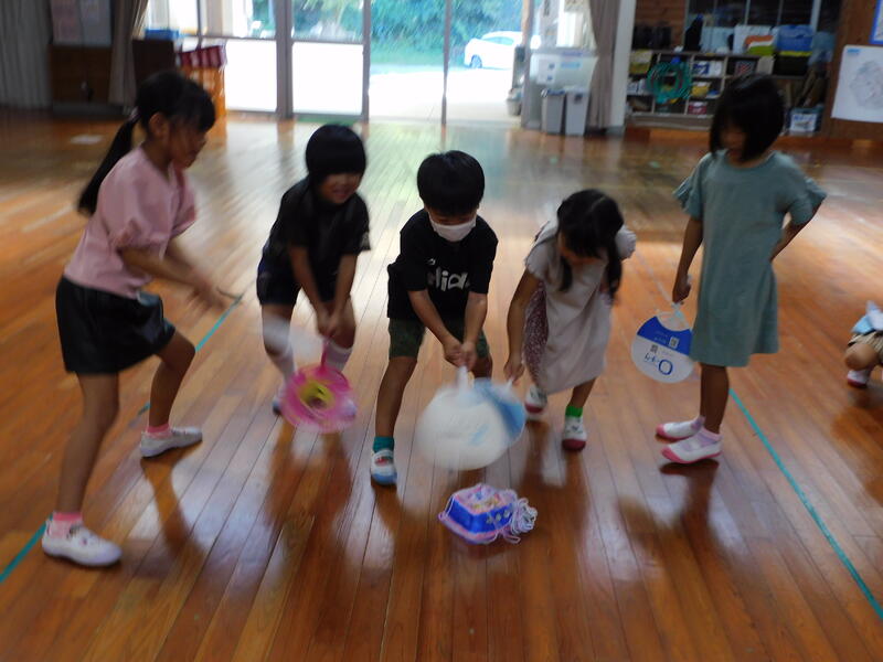 1年生は、図工の時間に作成したものをうちわであおいで、どれが速く動くか競争して楽しみました!