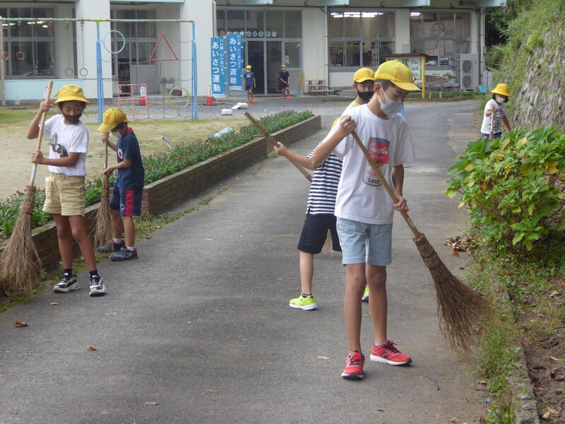 朝からのボランティア活動で掃き掃除をやってくれる子どもたちの姿も見られます。