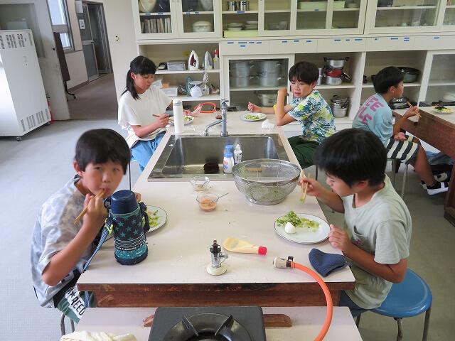 6月25日、5・6年生は家庭科の授業で調理実習をしました。6年生は、朝食のメニュー(ご飯やみそ汁、卵料理等)を、5年生はゆで卵や湯で野菜を作りました。試食の際は、一つ一つ味を確かめながら食べていました。