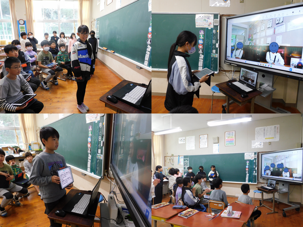 10月29日(水)の1時間目に、4年生が湯出小4年生とのオンライン交流を行いました。先日行った社会科見学の感想をお互いに伝え合いました。既にお互い顔見知りになっているので、和やかな雰囲気で交流は進んだようです。水東小からは、通潤橋に関するクイズなども出題し盛り上がりました。これからも様々な形で交流を深めていきたいと思います。