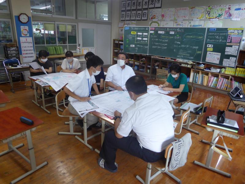 ②複式学級で普段から取り組んでいるため、3年生は、自分たちで授業を進めて行く順序がわかっており、先生がいない時間もしっかりと学習を進めていた。4年生は、学習リーダーが板書(学習内容を黒板に書くこと)しており、先生が戻ってきたとき、どのように学習が進められてきたか、わかるようにしていた。