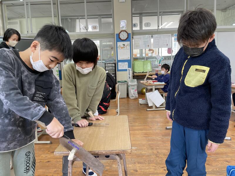 3,4年生の教室からは、工作で木づちを叩くにぎやかな音が校舎に響きました。