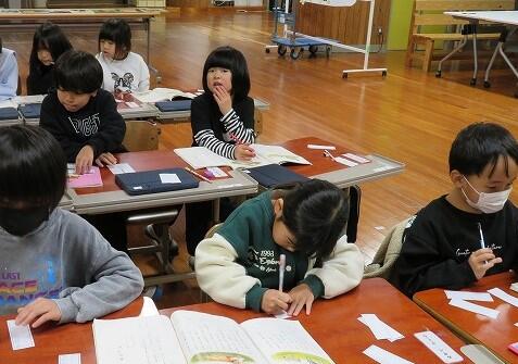 今日の1年生の国語の授業は、2月7日の研究発表会の公開授業に向けて少しでも本番に近い状況で行うため多目的ホールで行いました。いつもと違った学習環境でもいつもと変わらず一生懸命に学習に取り組む1年生でした。