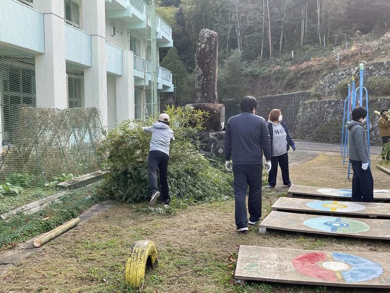 12月18日(土)、5・6年生の学年行事として門松作りを行いました。8区の竹下さんのご指導のもと、5・6年児童、保護者、担任の山本先生に加え、校長先生もご参加くださいました。砂のうの運搬や鉈(なた)や鋸(のこぎり)で竹を割るなど、普段の生活ではなじみのないことばかりでしたが、子ども達は一生懸命取り組んでくれました。