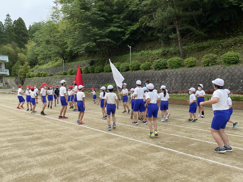 PTA美化作業できれいになった運動場で開閉会式と技巧走の練習を行いました。