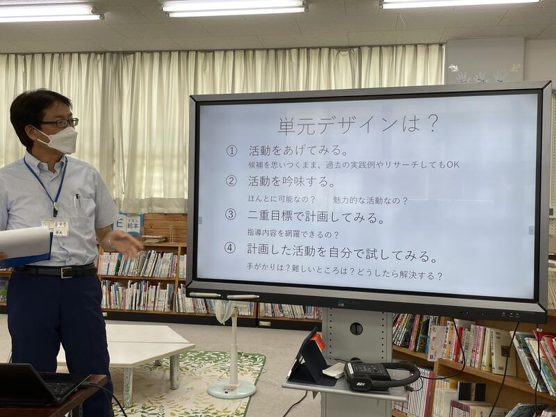 7月29日午後、水俣第一小学校より講師として指導教諭である寺川芳夫先生においでいただき、国語の学習構想案作りの校内研修を行いました。