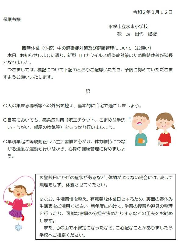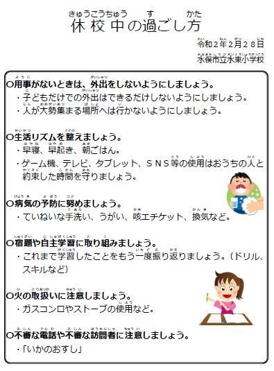 令和2年3月2日(月)~3月15日(日)まで新型コロナウイルス感染症対策のため臨時休校になりました。(状況によっては期間延長の可能性有り)2月28日に子どもたちへ休校中の過ごし方について以下の内容で指導しています。子どもたちが安全に生活できますようお声掛けをよろしくお願いします。