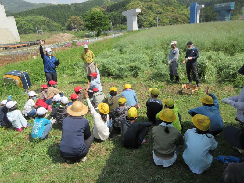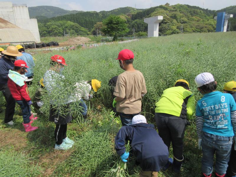 子ども達は、自分たちの身の丈ほどもある菜の花を、2人組で協力し、一生懸命刈取っていました。終わり際には、「えー、もっと刈りたかったです。」と残念がるほど、やりがいを感じながら楽しく活動していました。