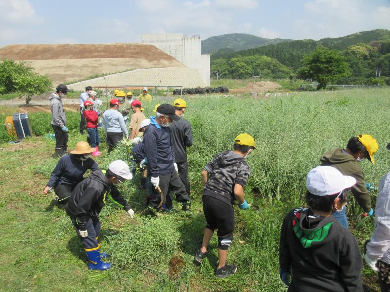 本日5・6時間目に、3~6年生で「菜の花体験事業」として菜の花の刈取り作業を行いました。