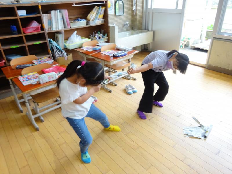 次に新聞紙を使って、変身する道具を作り始めました。なかなか新聞紙に触れる機会のなかった子どもたちですが、上手に割いたり、丸めたりして作りたいものを一生懸命作っていました。「新聞紙で遊ぶのって楽しい!」「家でもやってみよう!」と大満足の様子でした。