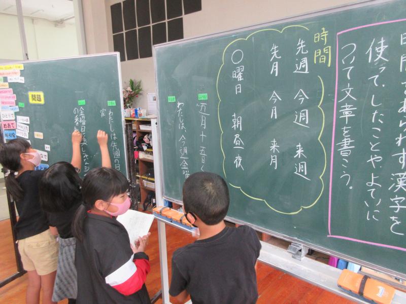 3年生1時間目の国語科「漢字の広場」の学習です。「時」をあらわす漢字を使い、過去の出来事や予定についての文を作りました。写真は、作った文を黒板に書き、共有しているところです。