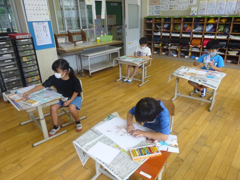 本日、図工の授業でクレパスやパステルを使ったぼかし遊びに挑戦しました。クレパスやパステルで模様や絵を描き、それを手の指やティッシュを使ってぼかしました。始めての体験で、子どもたちは「おー!すごい!」や「早くやってみたい!」とやる気満々でした。