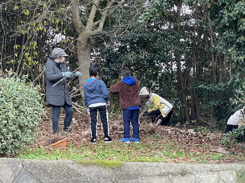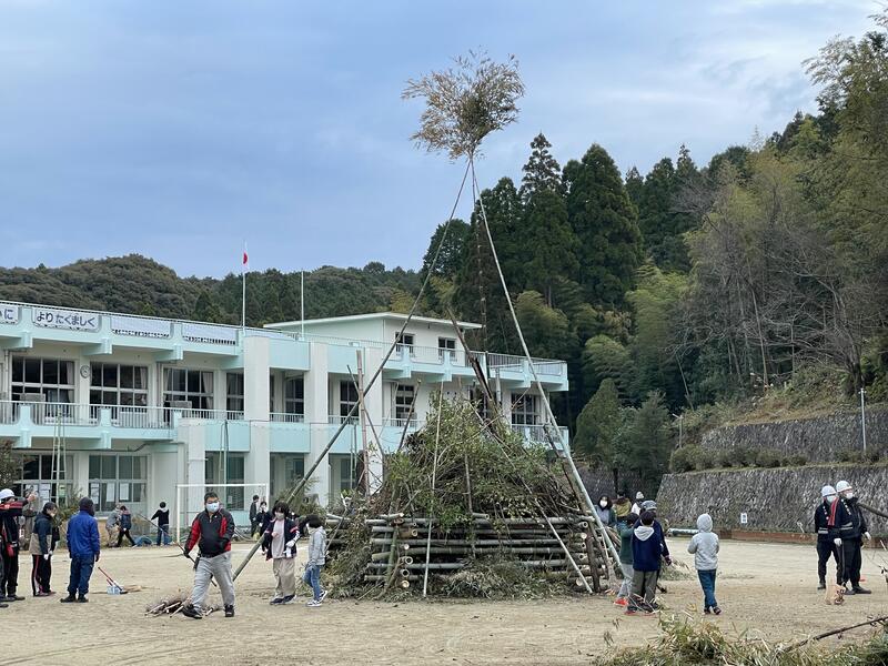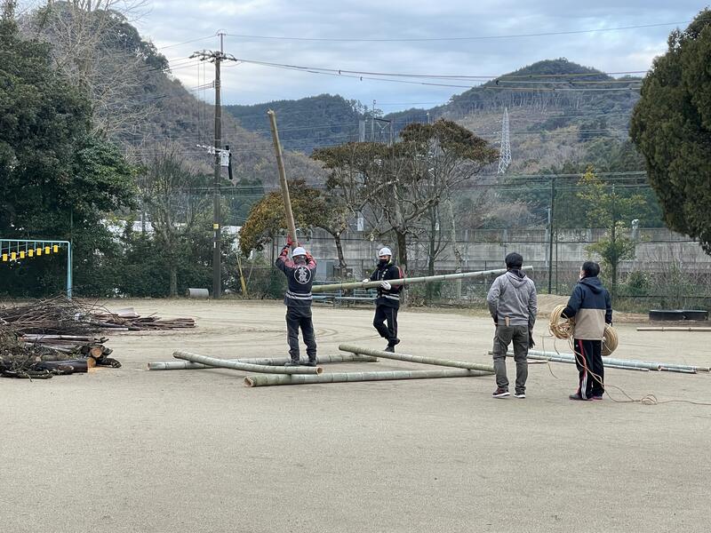 天候にも恵まれ、児童や保護者のほか、地域住民や地元消防団のご協力を得て、約70人が集まり、昨年末に伐採した竹や木でやぐらを組みました。