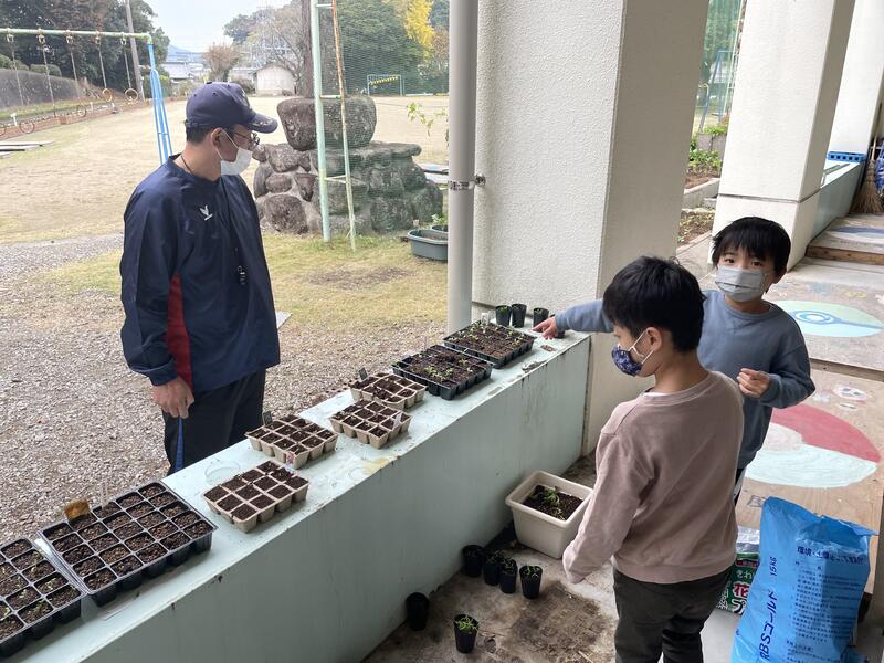 11月に入り、矢車草や金魚草などの種まきをしたり、パンジーをプランターや学級園に植えたり、花が少しずつ増えてきています。