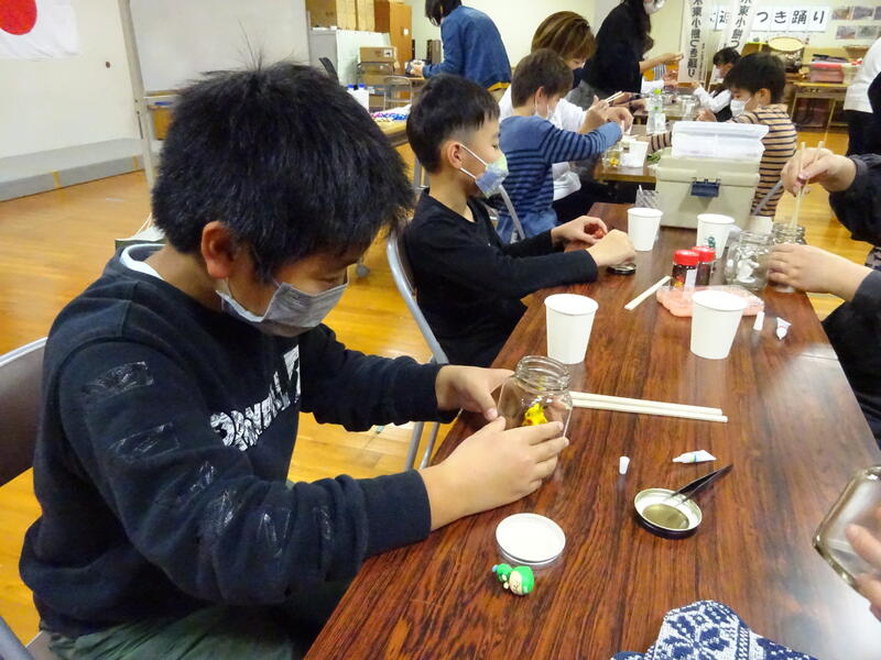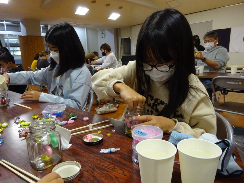 それぞれが準備してきた小物を小瓶に詰めてキラキラ輝くスノードームが出来ました。