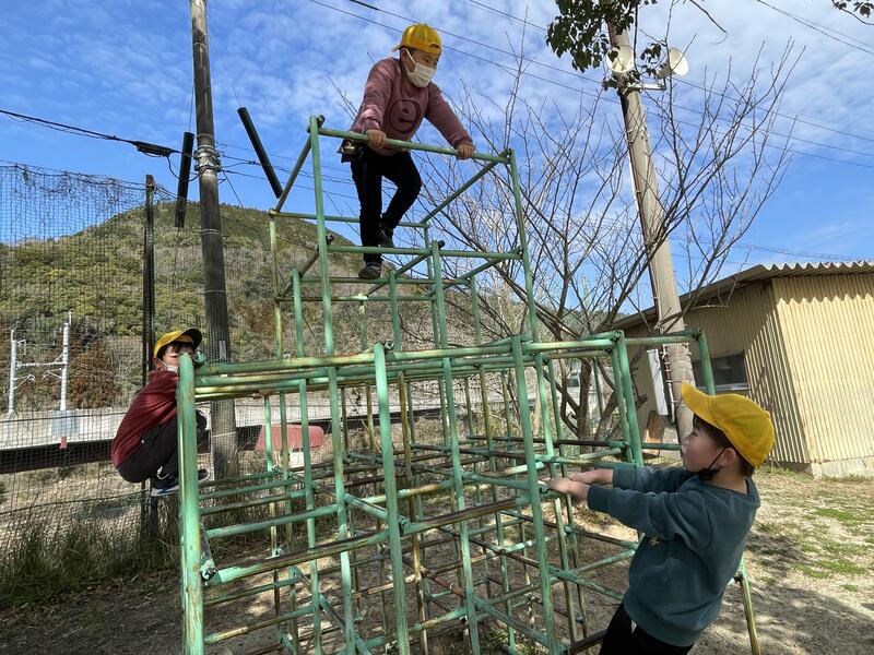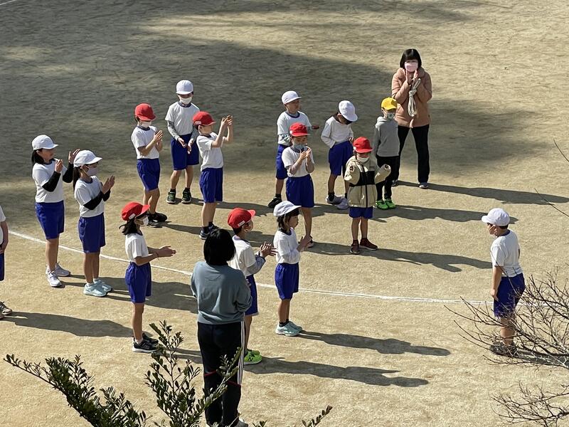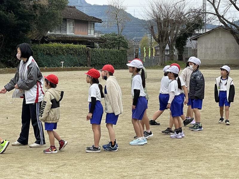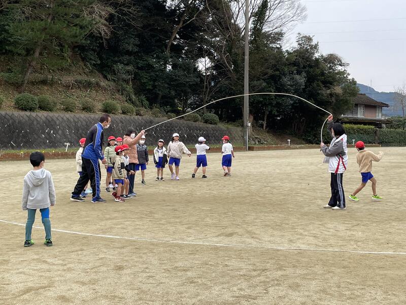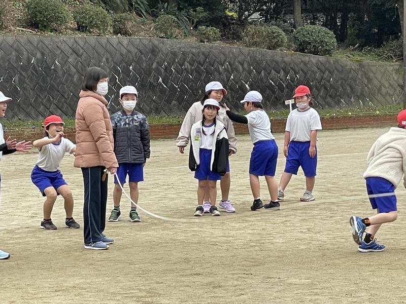 今日、1,2年生は、運動場で元気に大なわとびに挑戦していました。