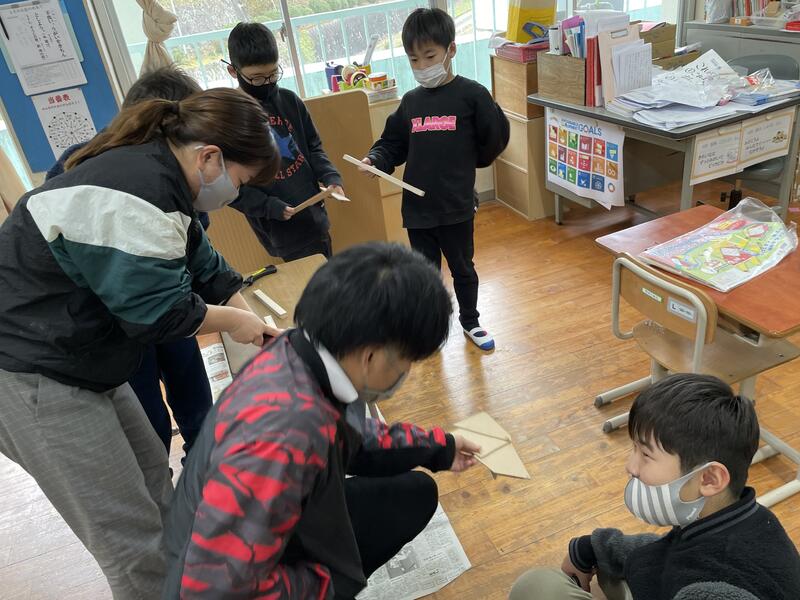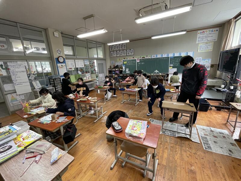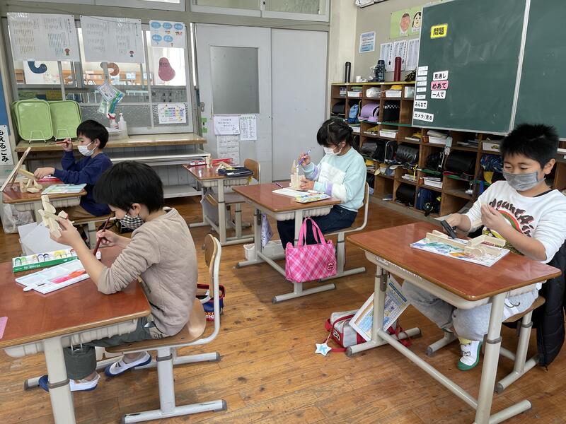 3,4年生の教室からは、工作で木づちを叩くにぎやかな音が校舎に響きました。