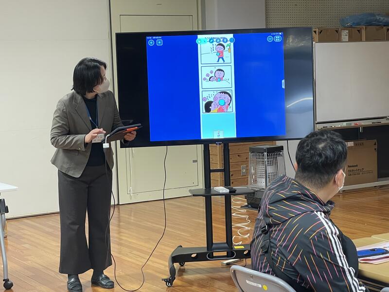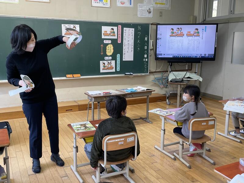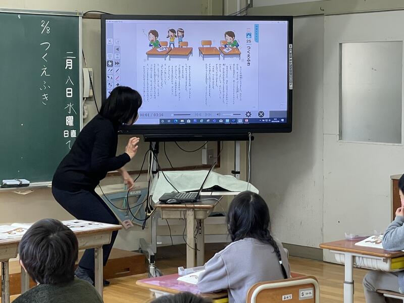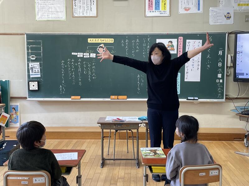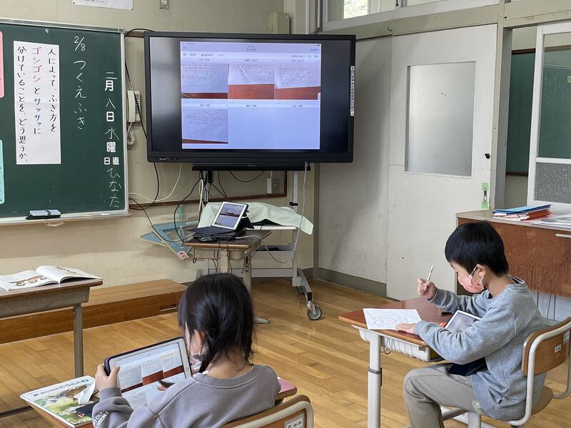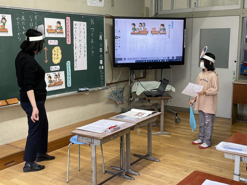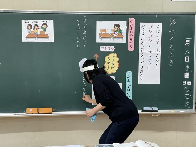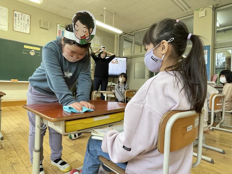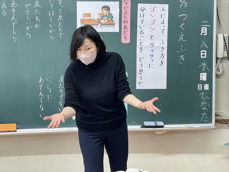 「つくえふき」という教材を使って、誰の机かによって、ふき方を「ゴシゴシ」と「サッサッ」に分けている主人公のふき方をどう思うか話し合いました。