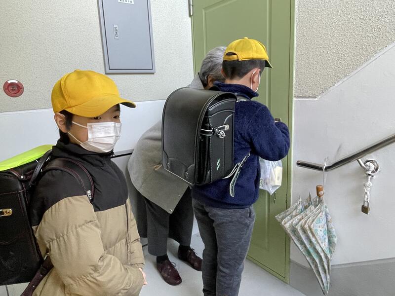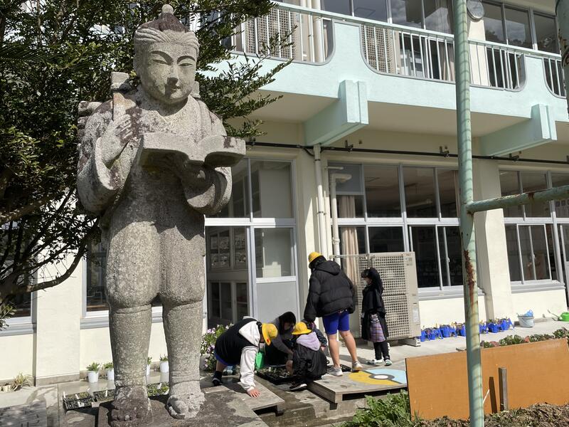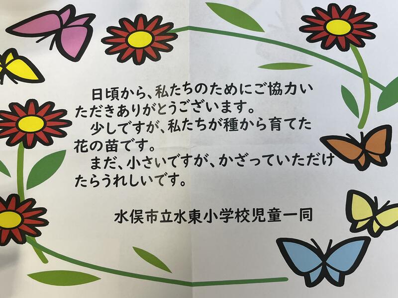 子どもたちがお宅を訪問し、自分たちが育てた花の苗をプレゼントしました。