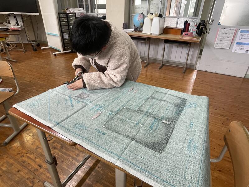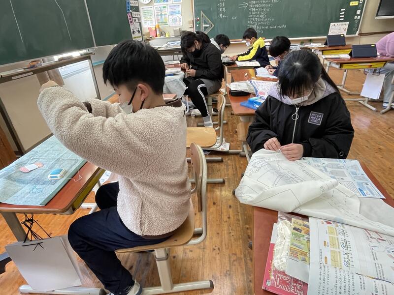 5年生はエプロンづくり。慎重に布を切っていました。