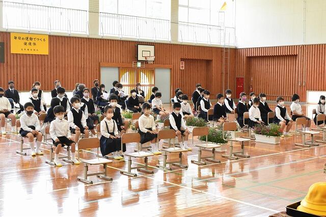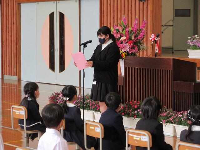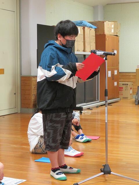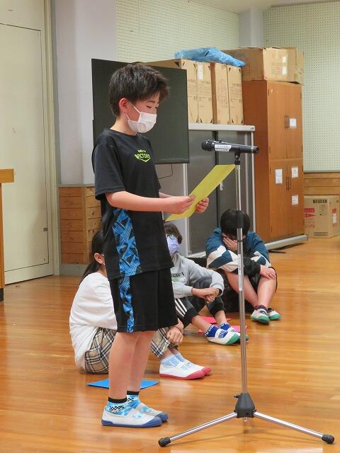 全校集会では、6名が作文発表で今年度の自信の目標などを話してくれました。ほかの児童も真剣に聞いていました。