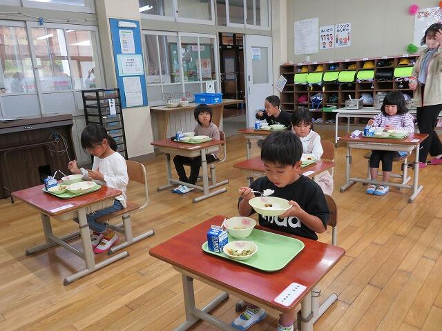 今年度最初の給食でした。1年生にとっては小学校で初めて食べる給食。みんな行儀よく食べていました。