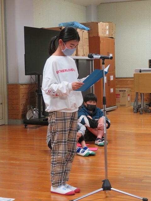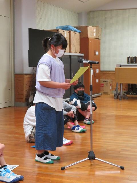 全校集会では、6名が作文発表で今年度の自信の目標などを話してくれました。ほかの児童も真剣に聞いていました。