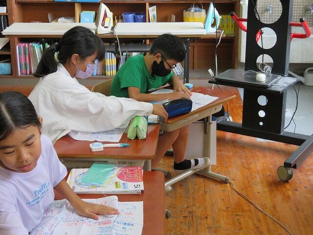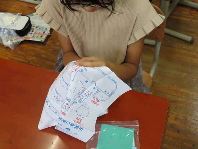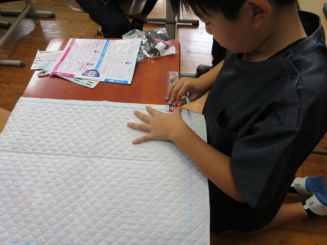 5・6年の家庭科の授業では、6年生が、ナップザックづくり、5年生は、練習用布を用いて波縫いなどの練習などを行っています。どちらの学年も集中して取り組んでいました。