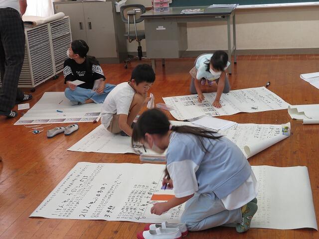 今週末の10月7日8日は、科学展があります。それに向けて自由研究のまとめを頑張っています。(写真は、3年生の様子)また、5・6年生は、家庭科の時間に制作したナップザック(6年)ワッペン(5年)を職員室に見せに来てくれました。