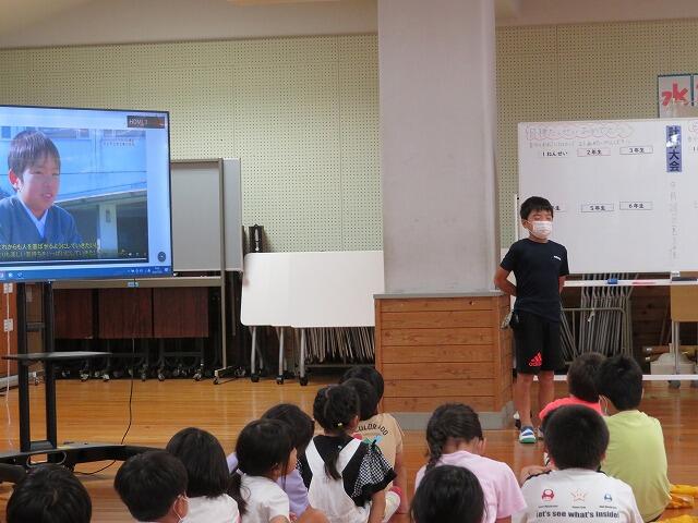 今回の児童集会は、「げん気委員会」からの発表でした。委員会で採った基本的な生活習慣に関するアンケート結果を発表し、学校生活・家庭生活で気を付けることや頑張ることを呼びかけました。また、発表後の振り返り(感想交流)も多くの人が発表してくれました。