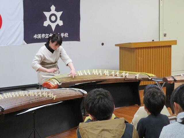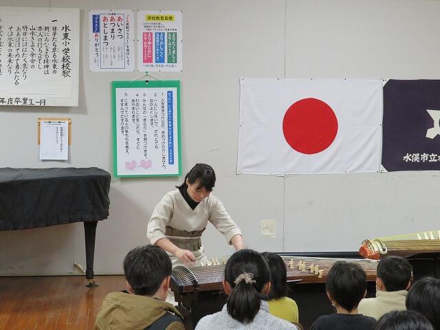 12月21日の3校時、多目的ホールにて箏の演奏会がありました。これは、「熊本県立劇場演奏家派遣アウトリーチ事業」の一つとして行われ、水東小の全児童が、箏の演奏に聞き入りました。箏の演奏家、小路永さんは、3種類の箏を用いて子どもたちも知っている曲から箏のために作られた曲までいろいろ演奏していただきました。本物の箏の演奏を聴く機会が少ない子どもたちにとって貴重な経験となりました。