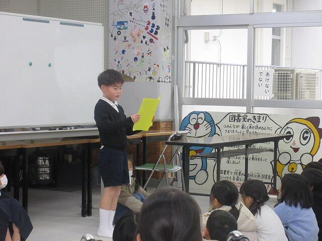 12月22日(金)2学期の終業式を行いました。各学年・各クラスの代表が、2学期を振り返って自身の課題や3学期に向けて頑張りたいことなどを発表しました。また、科学展や蘇峰展、読書感想文・標語等で入賞した子どもたちを表彰しました。