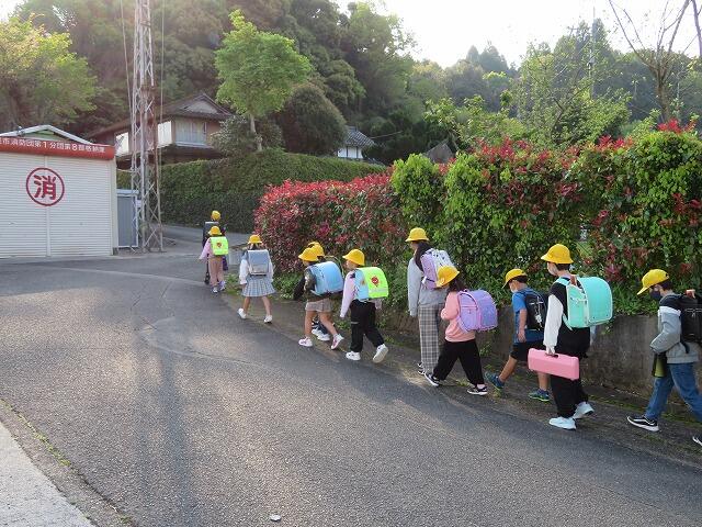 4月10日(水)、1年も他の学年と一緒に並んで登校班ごとに登校しました。ランドセルもランドセルカバーもピカピカに光っていました。登校班長さんも1年生のペースに合わせて上手にリードして歩いていました。