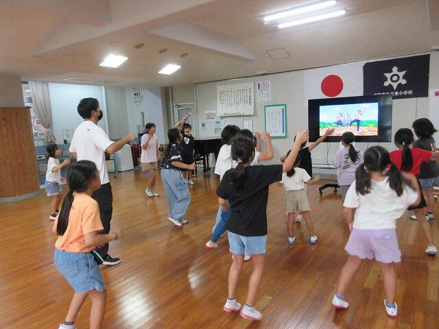今週に入りずいぶん暑さも和らいできましたが、先週までは暑い日が続いていて暑さ指数(WBGT)も「危険」を示していましたので、9月18日(水)の昼休みは、多目的ホールで映像に合わせてダンスをしました。はじめは参加者も少なかったのですが時間がたつにつれ、参加者も徐々に多くなってきて、みんなで楽しい時間を過ごしました。