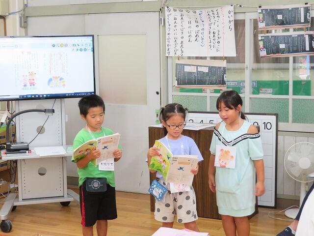 9月25日(水)の3時間目に1年生の国語の研究授業がありました。「かいがら」というお話の音読劇に向け、どんなことに気を付ければよいのか話し合ったり、実際に練習したりしました。いつもと違い、先生方が参観されていたのでちょっぴり緊張していたようでした。でも、最後は、登場人物になりきって練習に励んでいました。