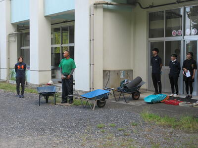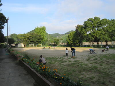 涼しいうちにと朝早くから集まっていただき、草刈り・除草シート貼りと作業していただきました。おかげで、校内が