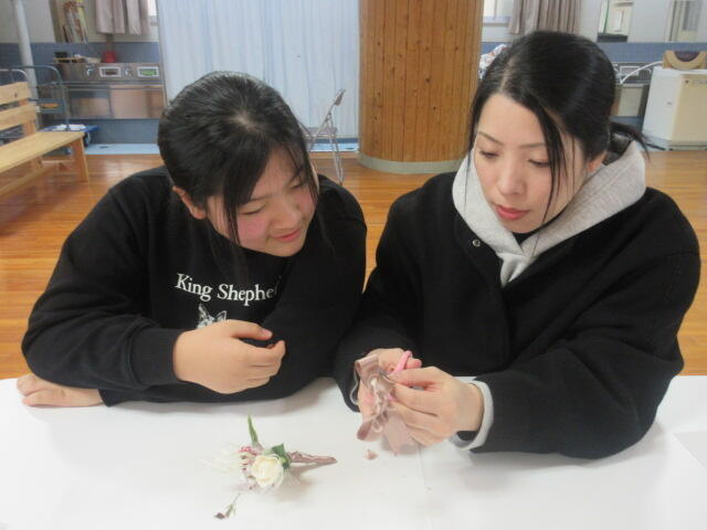 今年の6年生の親子行事は講師の方をお招きし、卒業式につけるコサージュを作りました。