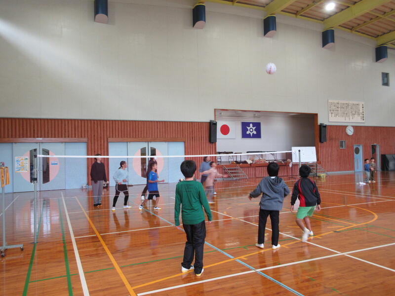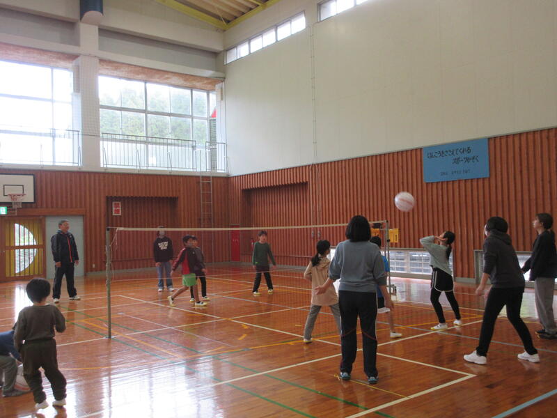 悪天候の中、体育館の中ではそれぞれ4チームの親子がバレーを楽しんでいました。子どもたちも、勝って喜んだ