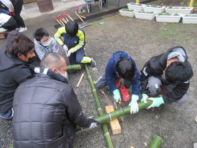 水東小学校の門松を作る5・6年生の学年行事が12月17日に行われました。