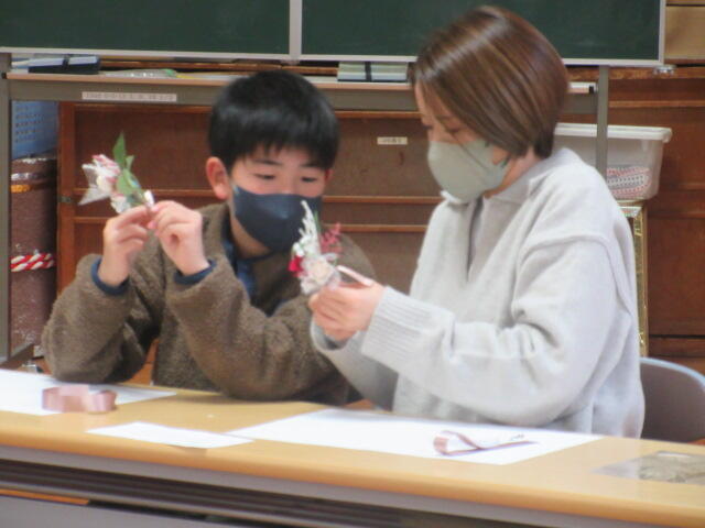 今年の6年生の親子行事は講師の方をお招きし、卒業式につけるコサージュを作りました。