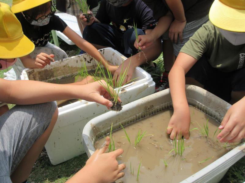 更に、土やお米の苗まで用意してくださり、実際に田植えを経験することができました。一つ一つの苗を植えていく作業を行ってみて、お米農家の方々の仕事や苦労についても体感することができました。初めての子ども達も多く、子ども達にとって、貴重な体験となりました。